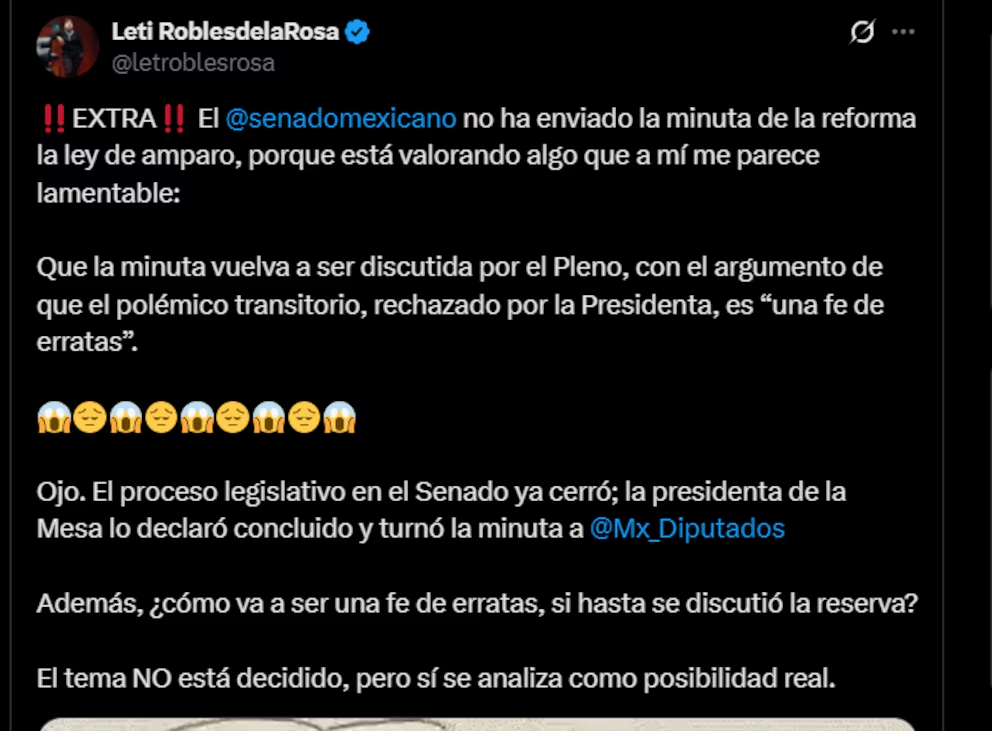 “Ojo. El proceso legislativo en el Senado ya cerró; la presidenta de la Mesa lo declaró concluido y turnó la minuta a @Mx_Diputados Además, ¿cómo va a ser una fe de erratas, si hasta se discutió la reserva? El tema NO está decidido, pero sí se analiza como posibilidad real», escribió Robles de la Rosa en X.