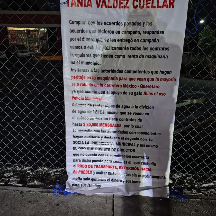 Cuatro lonas con mensajes en los que se da a conocer supuestos compromisos de precampaña y amenazas con exhibir actos de corrupción del actual gobierno municipal de Tepeji, aparecieron en distintos puntos de esa localidad.