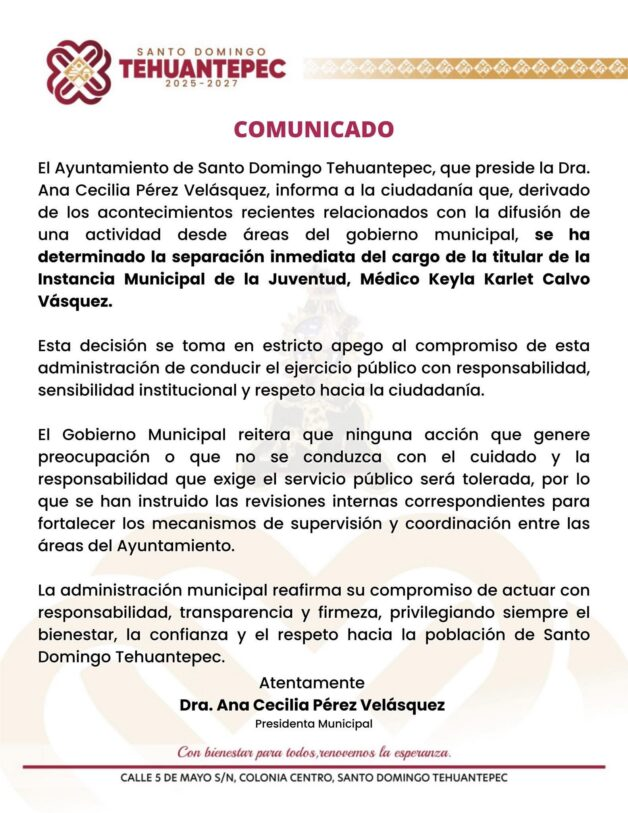 La alcaldesa del municipio oaxaqueño de Santo Domingo Tehuantepec, Ana Cecilia Pérez Velásquez, anunció la separación inmediata de la titular de la Instancia Municipal de la Juventud, la médico Keyla Karlet Calvo Vásquez, tras la difusión de un taller para elaborar un ‘Kit forense en caso de desaparición’, que levantó la indignación de colectivas, activistas y organizaciones civiles.