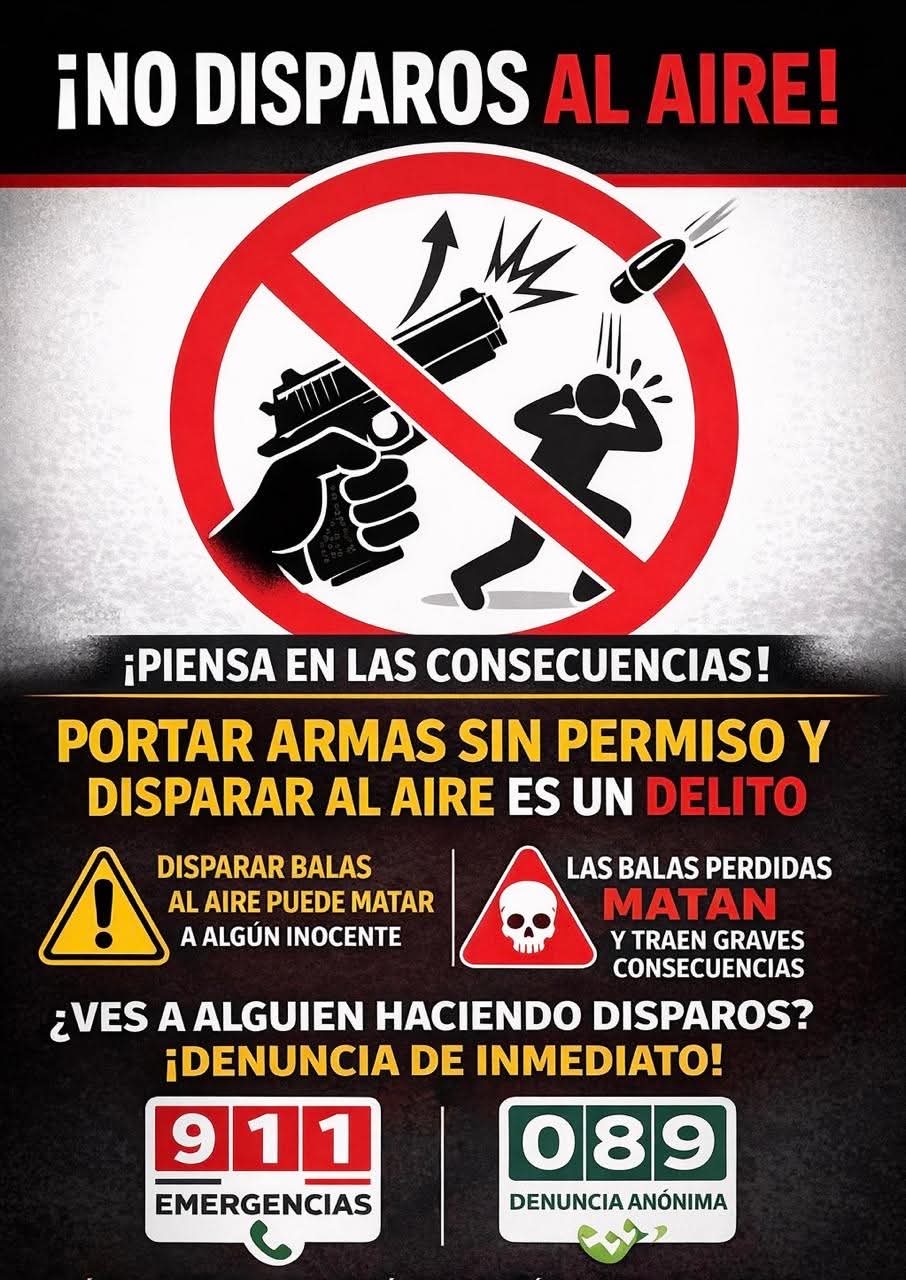 La Secretaría de seguridad pública municipal de Tepeji exhorta a la ciudadanía a actuar con responsabilidad y a denunciar a quienes por «festejo» para recibir el Año Nuevo realicen detonaciones de armas de fuego.
