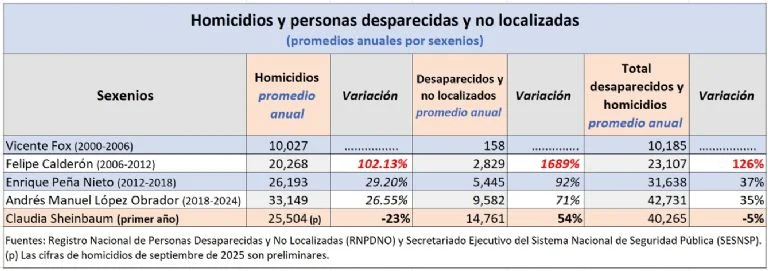 Durante el primer año de gobierno de la presidenta Claudia Sheinbaum los homicidios disminuyeron 23%, pero las desapariciones aumentaron 54% en comparación con el promedio anual de incidencia de ambos delitos durante el sexenio de Andrés Manuel López Obrador, indican cifras oficiales.