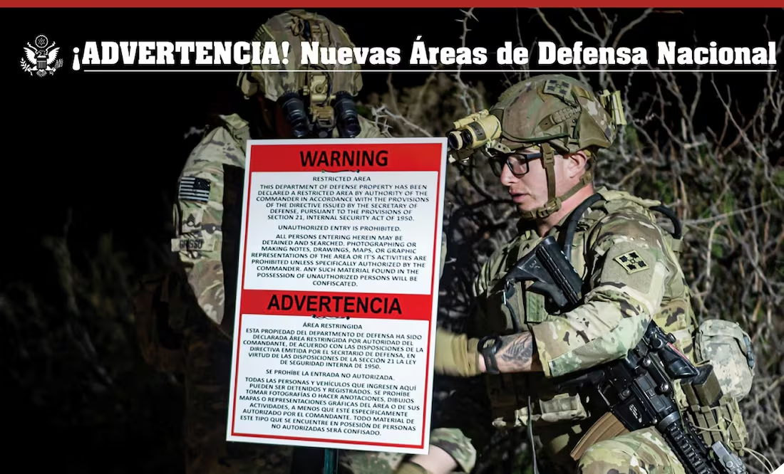 El mensaje señala que ciertas áreas de la frontera sur de Estados Unidos han sido designadas como zonas de defensa nacional.