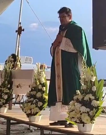 El párroco Valdés Tovar durante la misa realizada este domingo por la tarde en el terreno denominado Zona Cero, que está en el ejido de San Primitivo, entre los límites de Tlahuelilpan y Tlaxcoapan, invitó a los familiares de las víctimas que ahí perdieron la vida a que volteen su mirada a Jesús quien nos enseñó a vivir para salir adelante, por lo que hizo hincapié en la acción de no perder la fe y seguir el ejemplo de Juan El Bautista.