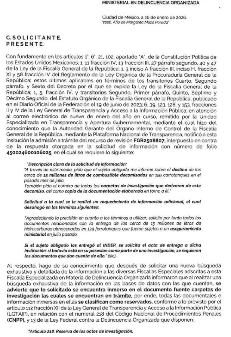 Según el argumento de la FGR, revelar el destino de los millones de litros de combustible “hace vulnerable la debida integración”