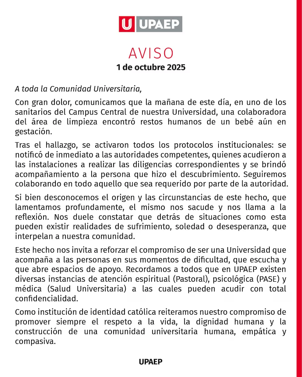 Además, la UPAEP informó que la trabajadora que realizó el hallazgo recibió acompañamiento emocional y psicológico, y aseguró que continuará brindando su colaboración con las investigaciones oficiales en todo lo que sea requerido.