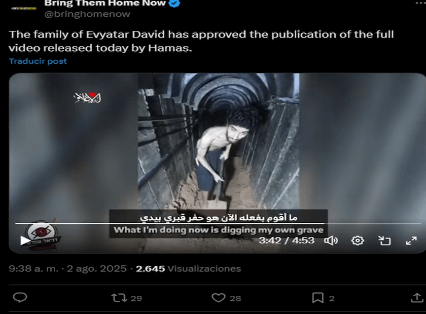 El brazo armado de Hamas, las Brigadas Al Qasam, difundió este sábado un nuevo vídeo del rehén israelí Evyatar David, de quien ya publicó imágenes el viernes mostrando su extrema delgadez, en el que cava su propia tumba dentro de un túnel en la Franja de Gaza.