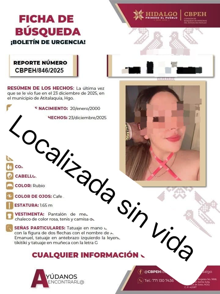 Dias antes había sido reportada como desaparecida por su familia, señalando que la última vez que la vieron fue el pasado 23 de diciembre de este año en el municipio de Atitalaquia.