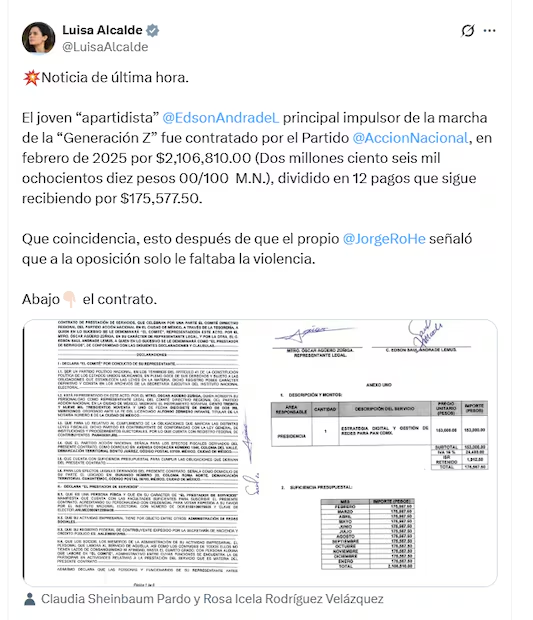 Luisa Alcalde exhibe contrato de Edson Andrade, impulsor de marcha Generación Z; PAN le habría pagado más de 2 mdp