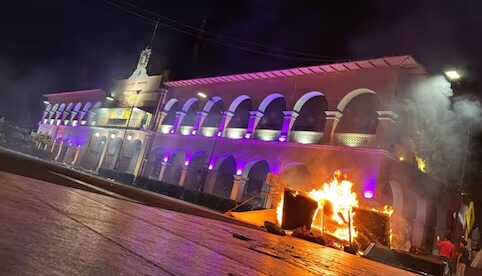Un grupo de personas que se manifestaba esta noche en Apatzingán, Michoacán para protestar por los asesinatos del alcalde de Uruapan, Carlos Manzo, y el líder limonero, Bernardo Bravo, quemó el Palacio de Gobierno del municipio.
