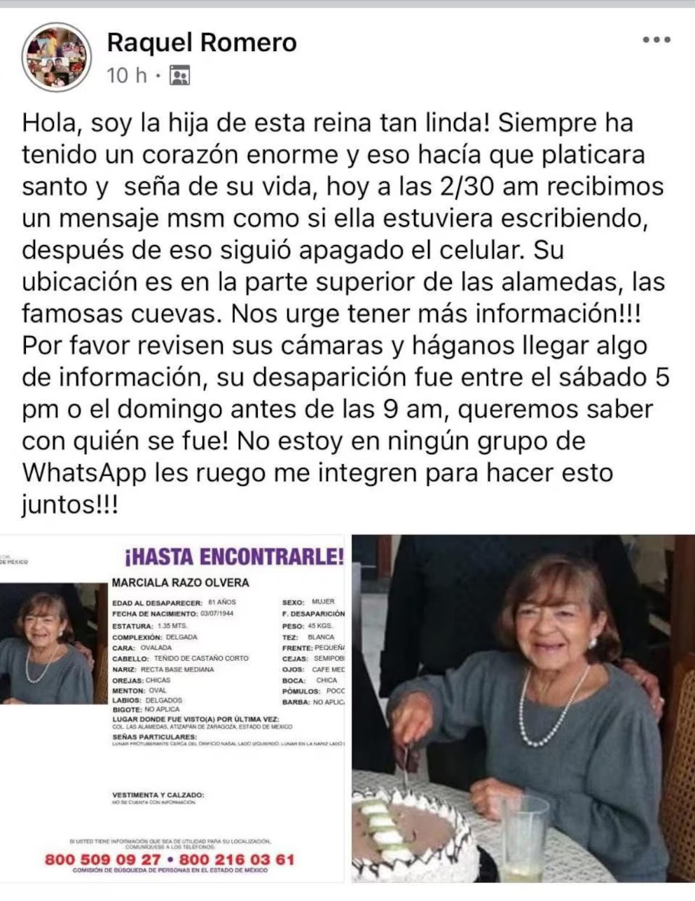 Tras cuatro días de intensa búsqueda, fue localizada sin vida Marciala Razo Olvera, una adulta mayor de 81 años, vecina del fraccionamiento Las Alamedas, en Atizapán de Zaragoza, quien había sido reportada como desaparecida desde el pasado viernes 22 de agosto.