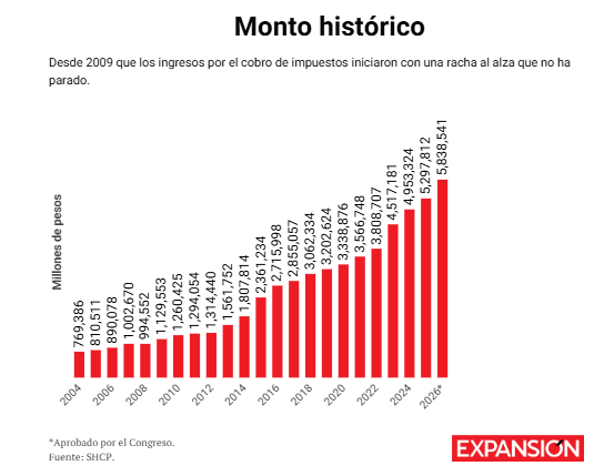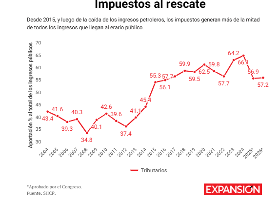 La Ley de Ingresos de la Federación (LIF) aprobada para 2026 refiere que del total de todos los ingresos públicos, 57.2% serán tributarios, cuando en 2008 contribuyeron con 34.8%.