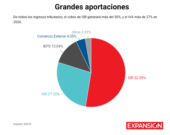 De todos los impuestos que se cobrarán en 2026, el ISR generará el 52.5%; el IVA el 27.2%, y el IEPS el 13%; estos últimos serán los gravámenes que contribuirán más al erario.