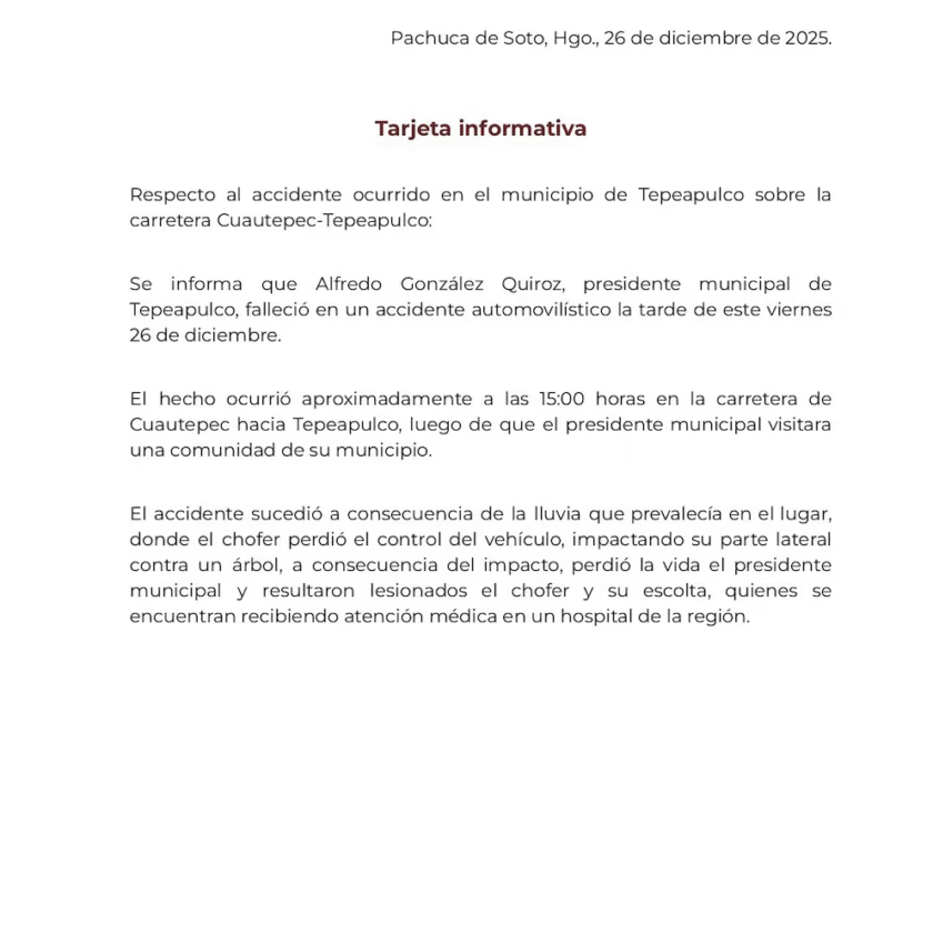 Alfredo González Quiroz, alcalde de Tepeapulco, Hidalgo, murió en un accidente automovilístico registrado durante la tarde de este viernes 26 de diciembre en la carretera Tepeapulco-Cuautepec.