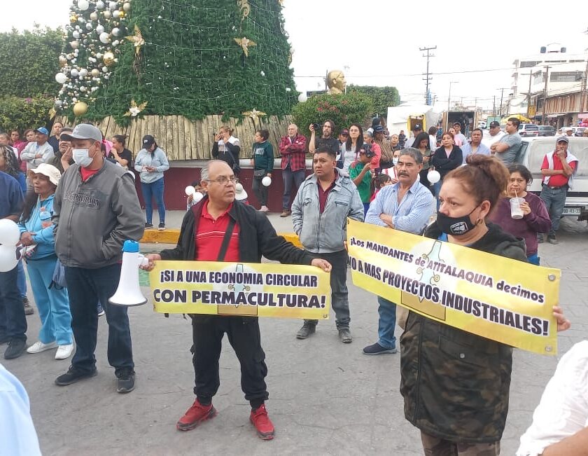 Un grupo de ciudadanos, algunos agitando globos, marcharon de manera pacífica del nuevo hospital del IMSS hasta el centro de Tlaxcoapan, para expresar su rechazó al proyecto del «Parque Ecológico y de Reciclaje», ya que aseguran que no se cuenta con un estudio de impacto ecológico y ante la falta de información que no ha proporcionado el gobierno.