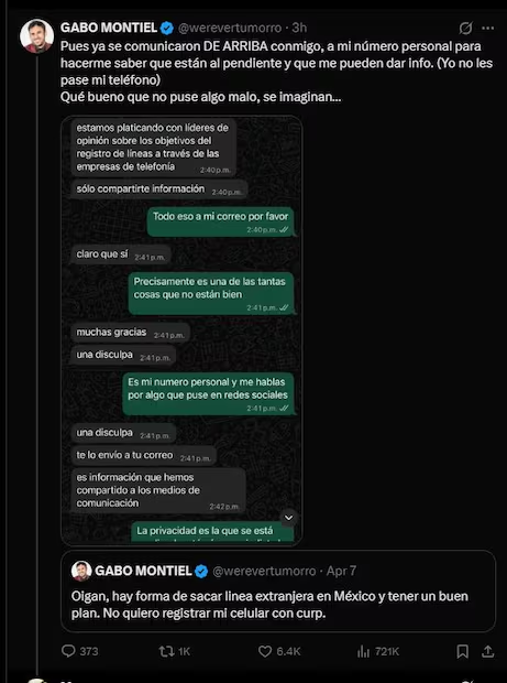 “Pues ya se comunicaron DE ARRIBA conmigo, a mi número personal para hacerme saber que están al pendiente y que me pueden dar info. (Yo no les pase mi teléfono). Qué bueno que no puse algo malo, se imaginan…”, expresó, acompañada de una captura de pantalla de la conversación, donde Montiel critica el abuso de privacidad.