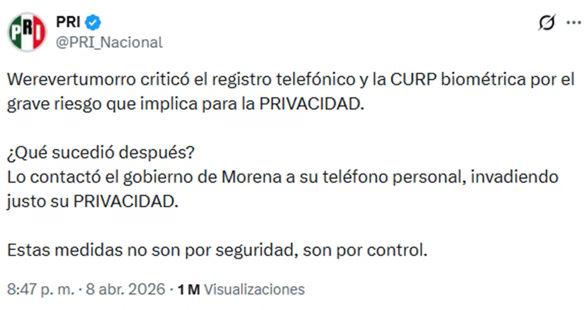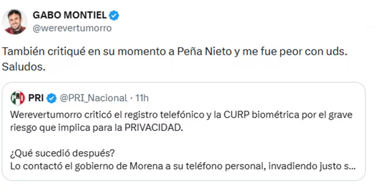 “Werevertumorro criticó el registro telefónico y la CURP biométrica por el grave riesgo que implica para la PRIVACIDAD. ¿Qué sucedió después? Lo contactó el gobierno de Morena a su teléfono personal, invadiendo justo su PRIVACIDAD”, se lee en la publicación.