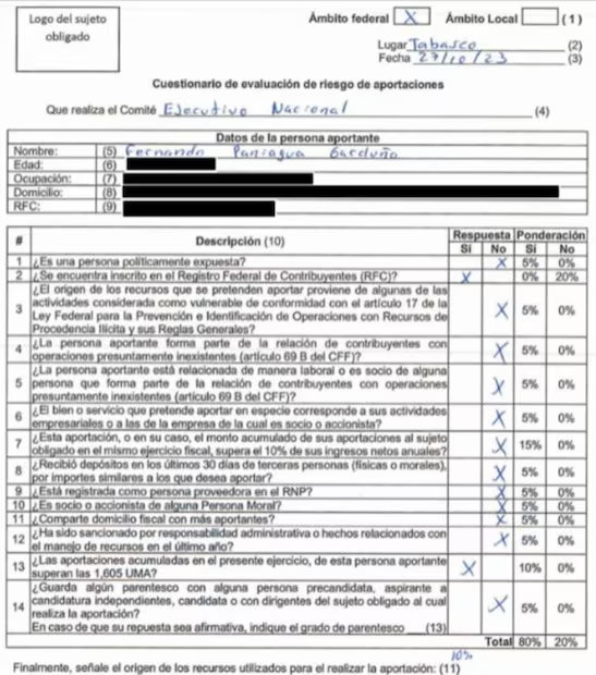 El viernes 27 de octubre de 2023 llenó, de puño y letra, el Cuestionario de Evaluación de Riesgo de Aportaciones en el cual dijo que el dinero provenía de sus ahorros y sueldos, pero, sobre todo, aseguró que no era socio o accionista de alguna “persona moral”. En este documento plasmó su firma sólo como “persona aportante”.