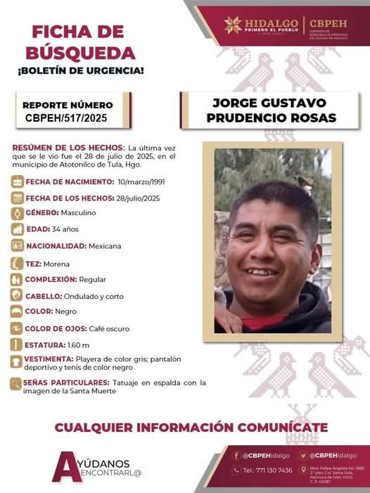 La última vez que fue visto fue el 28 de julio de este año en el municipio de Atotonilco de Tula y vestía una playera de color gris, pantalón deportivo y tenis en color negro. Esta persona tiene como seña particular un tatuaje en la espalda de la imagen de la Santa Muerte.