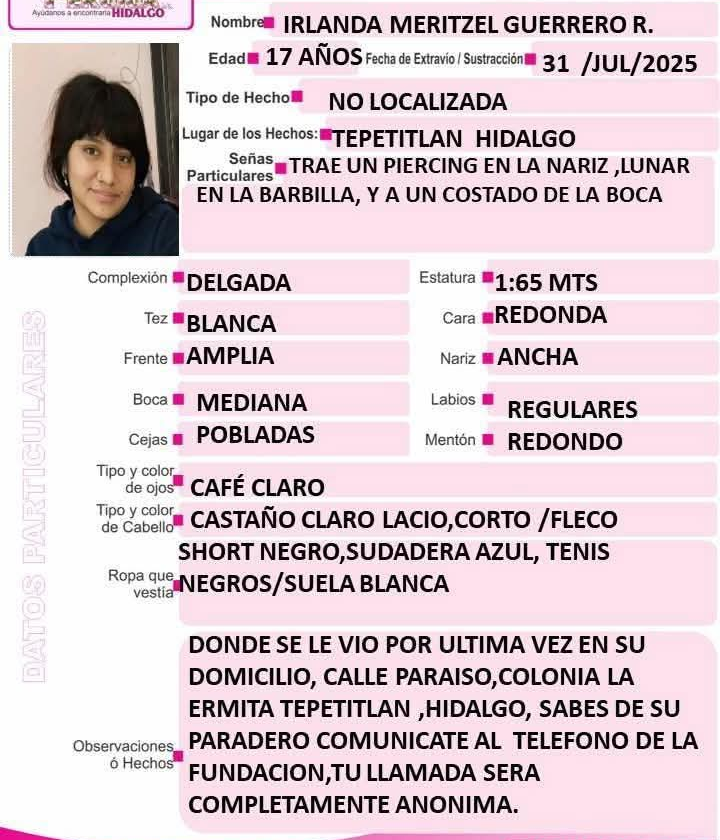 Por otra parte, el gobierno municipal de Tepetitlan solicita la colaboración de los ciudadanos para que ayuden a encontrar a Irlanda Meritzel Guerrero R. de 17 años de edad, que también se encuentra desaparecida.