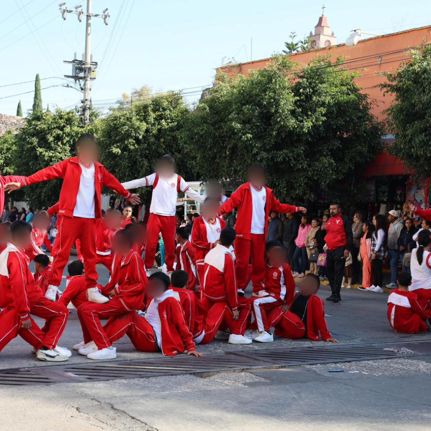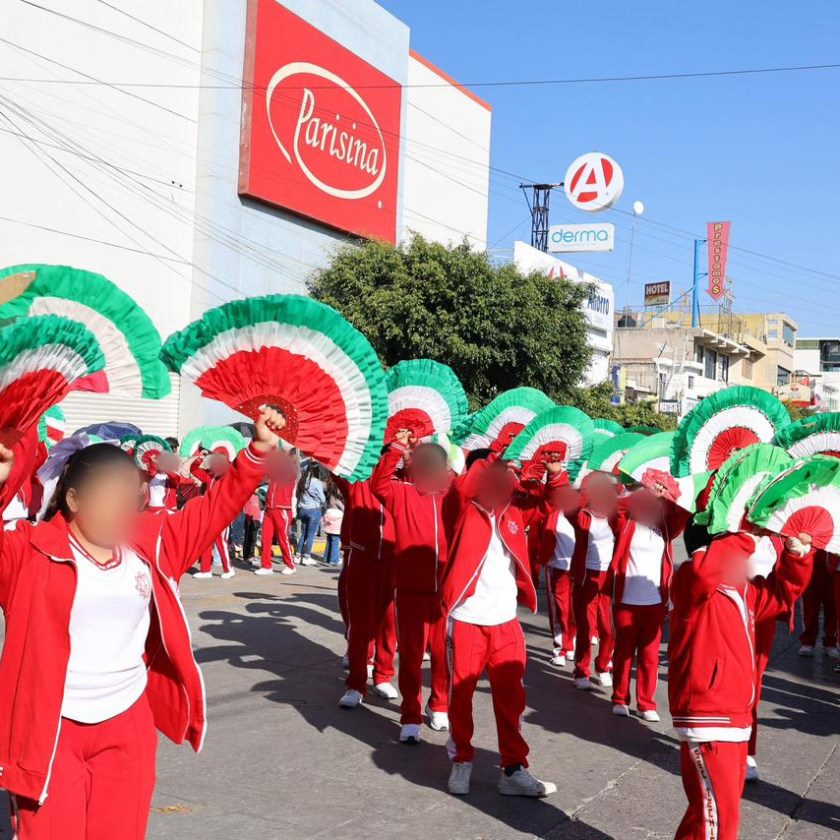 Durante el recorrido las y los estudiantes presentaron tablas rítmicas, estampas alusivas y representaciones históricas, demostrando talento y disciplina.