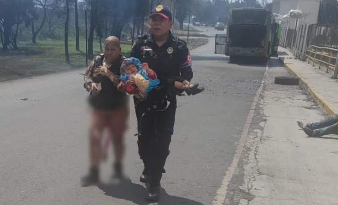 Una escena dramática tras la explosión en Puente de la Concordia: mujer resguarda de las llamas a su nieta, y policía las auxilia