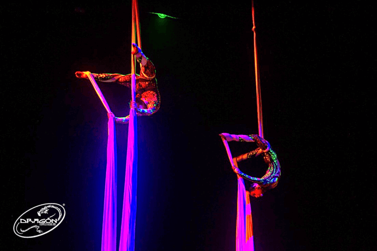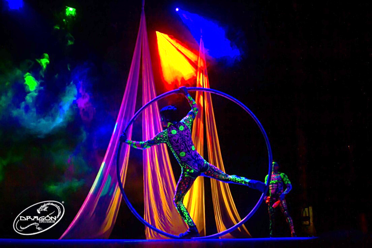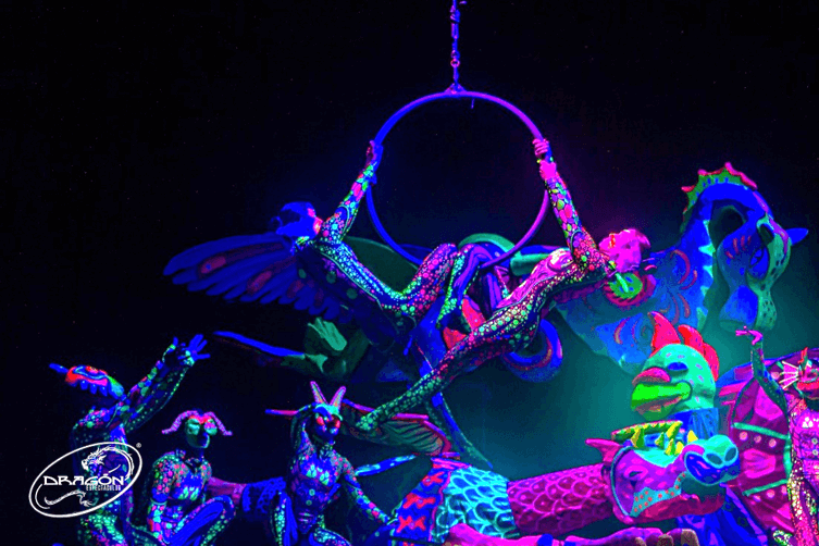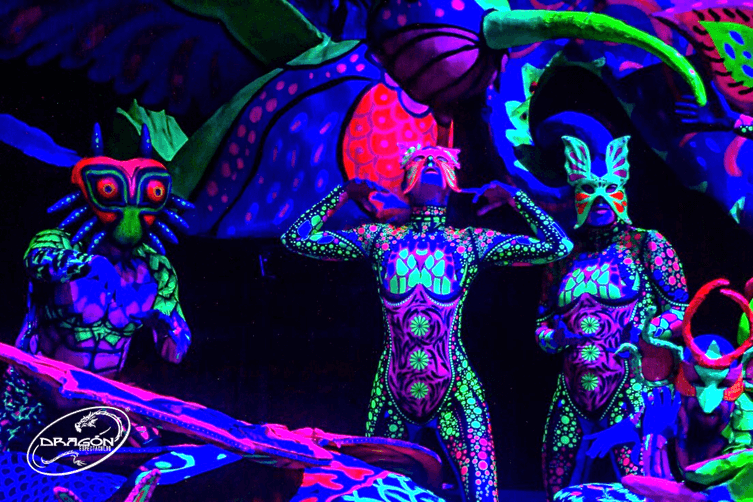 envueltos en un ambiente sensorial con humo, luces y efectos visuales que transforman el escenario. Los vestuarios fluorescentes y maquillajes brillantes intensifican la experiencia, generando un espectáculo hipnótico.