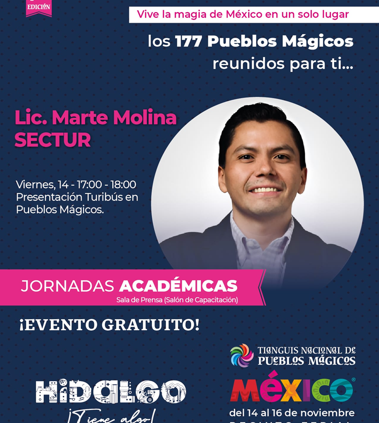 La jornada cerrará con la participación de Orlando Araque, especialista en patrimonio turístico, con la ponencia “El espíritu mágico del lugar: planeación integral en los Pueblos Mágicos”, y de Gianella Carvajal Soto, directora de las revistas México Desconocido y Escapadas, quien ofrecerá una charla dirigida a funcionarios y gestores de destinos sobre el valor de la narrativa local como herramienta de atracción turística.