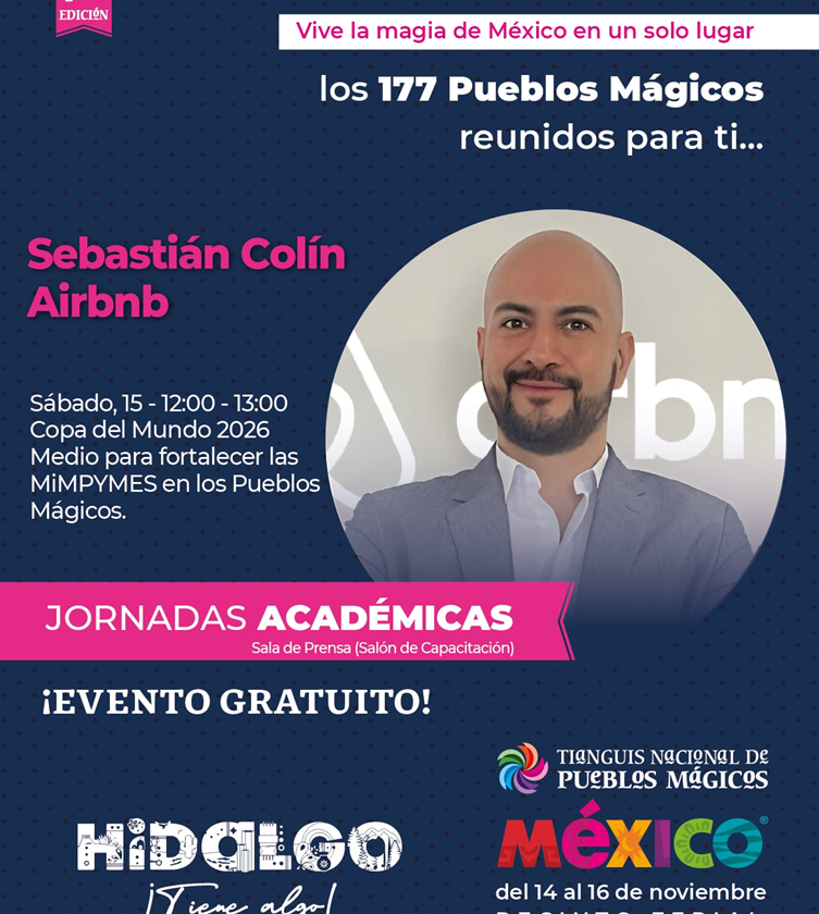 Asimismo, Sebastián Colín, director de Asuntos Públicos y Relaciones Gubernamentales de Airbnb, encabezará el foro “Copa del Mundo 2026: medio para fortalecer las mipymes en los Pueblos Mágicos”, donde se analizarán las estrategias para capitalizar el flujo turístico derivado del evento deportivo más importante del planeta.