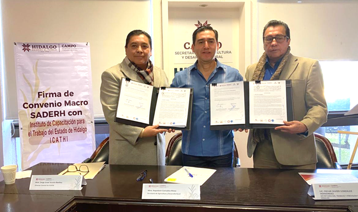 Firmaron este acuerdo Napoleón González Pérez, titular de SADERH; Óscar Javier González Hernández, secretario del Trabajo y Previsión Social de Hidalgo (STPSH); y Jorge Israel Acosta Benítez, director general de ICATHI.