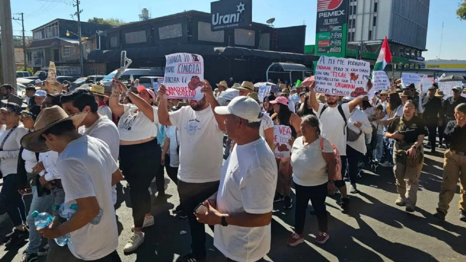 Los manifestantes también visten ropas blancas y pancartas con la exigencia de justicia para Carlos Manzo, quien fue asesinado a las 8:10 de la noche, aproximadamente, del sábado por un joven de 17 años de edad que a quemarropa le acertó seis de siete tiros, con una pistola calibre 0.9 milímetros.