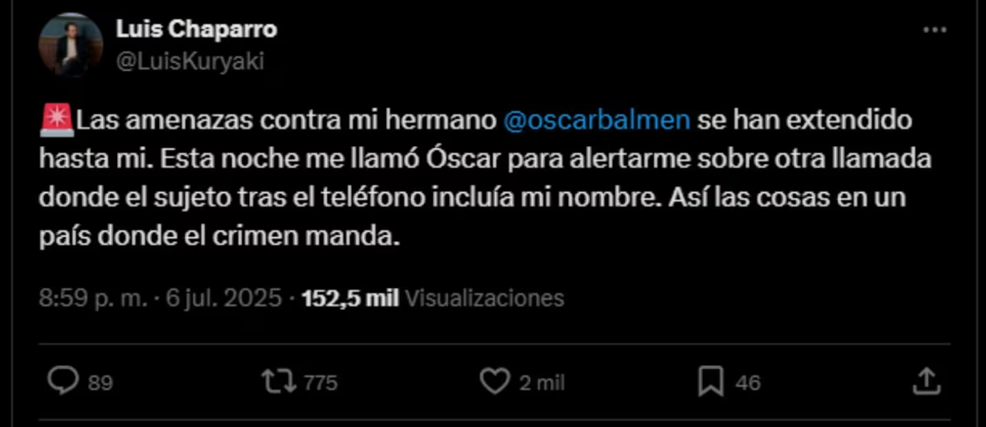 De acuerdo con Chaparro, en una nueva llamada en contra de Óscar Balderas, la persona tras el teléfono incluyó su nombre: «Las amenazas contra mi hermano se han extendido hasta mí», expresó.