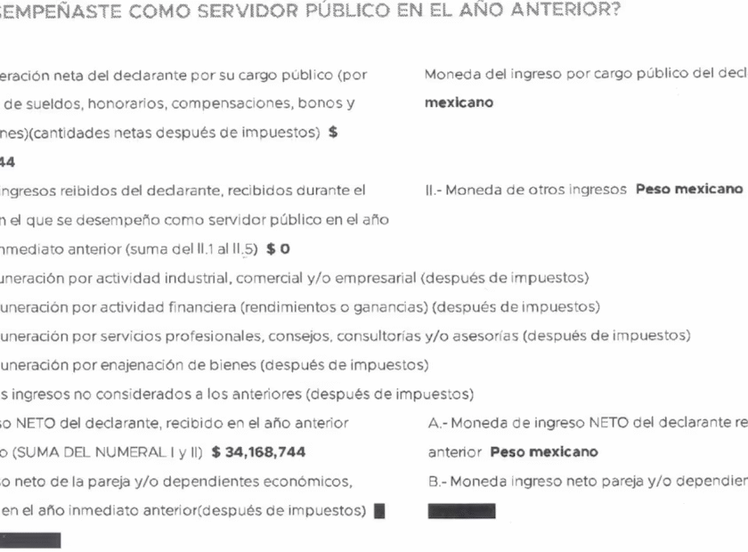En el apartado que corresponde a la información de su anterior trabajo, Limón señaló haber sido servidor público y registró un ingreso anual de 34 millones 168 mil 744 pesos, lo que equivale a más de 2 millones 847 mil pesos por mes.
