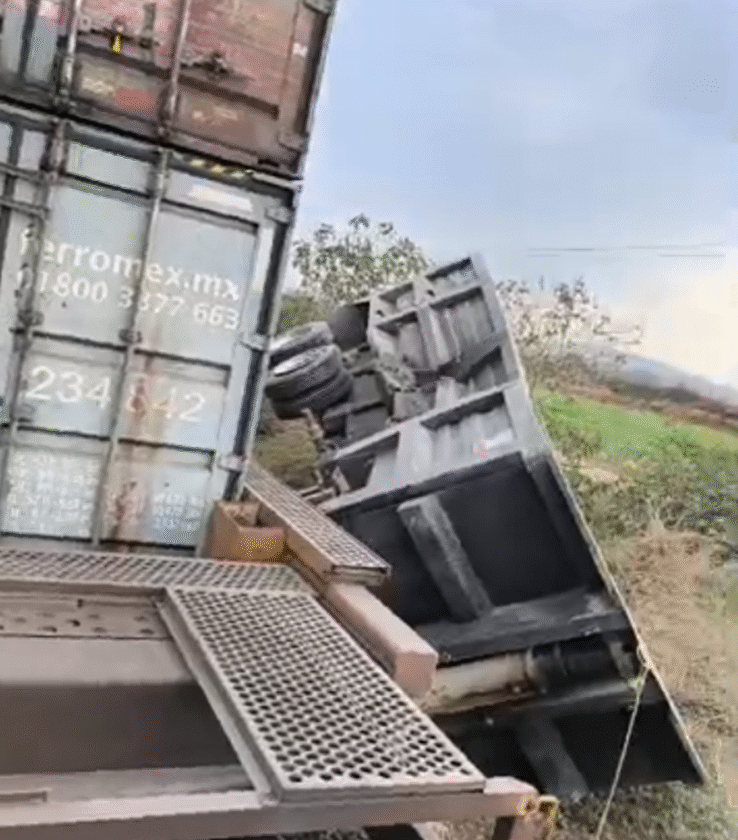 El conductor de un camión Torton en su intento por ganarle el paso al tren de la empresa Ferromex, literalmente se cruzó y fue arrastrado hasta quedar fuera de las vías.