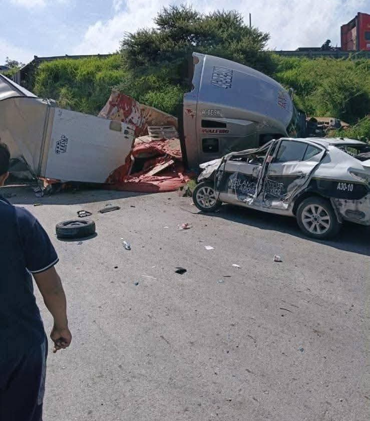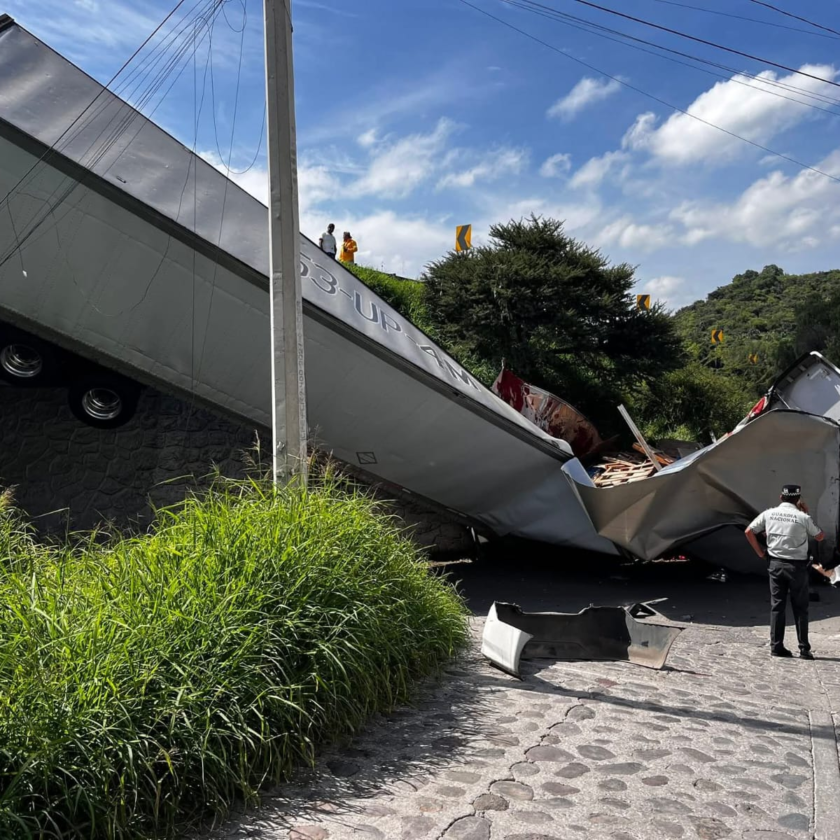 Por el brutal impacto, el tráiler se volcó y la caja seca que traía acoplada literalmente cayó por el puente que estaba en el lugar alcanzando un automóvil de seguridad privada que de igual manera se vio involucrado.