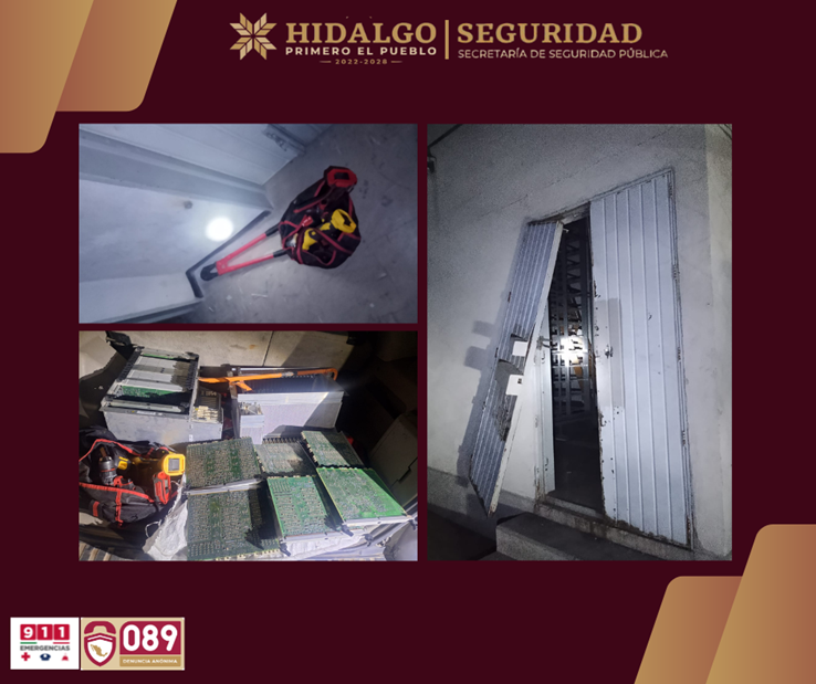Pachuca, Hgo.-Derivado de un reporte oportuno, elementos de la Secretaría de Seguridad Pública de Hidalgo (SSPH) lograron el aseguramiento de sujetos dedicados al robo de infraestructura de telecomunicaciones, tras ser sorprendidas al interior de una subestación de una empresa ubicada sobre la carretera Tula–Jorobas, a la altura del tramo Parque Industrial, en el municipio de Atitalaquia.