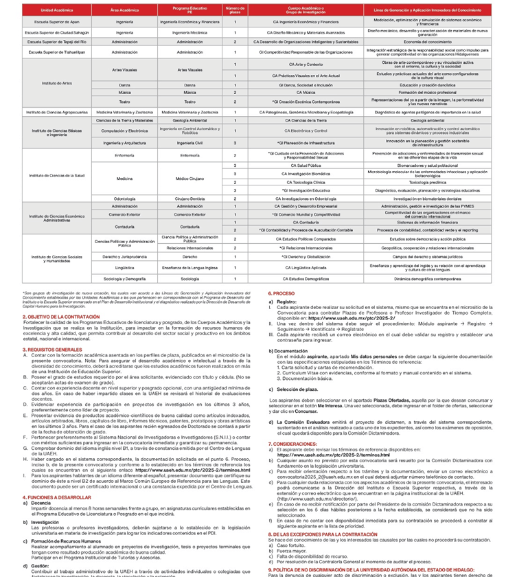 Las y los interesados podrán consultar la convocatoria completa en el siguiente enlace, https://www.uaeh.edu.mx/ptc/2025-2/docs/convocatoria-ptc-2025-2.pdf.