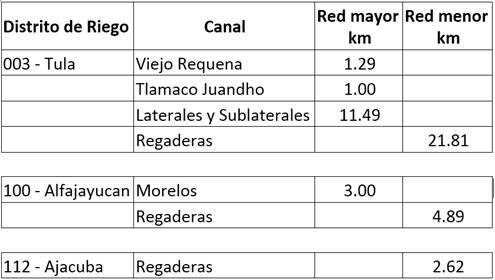 Pachuca, Hgo.- La Comisión Nacional del Agua (Conagua), a través de la Dirección Local Hidalgo, informa que, hasta el momento, el avance físico global de las obras de tecnificación en los distritos de riego 003 Tula, 100 Alfajayucan y 112 Ajacuba es del 44.35 por ciento, considerando en conjunto los canales principales y las canaletas regadoras.