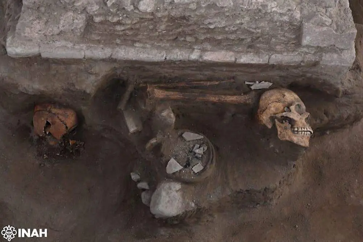 “En tres de los lados del nivel inferior del altar se hallaron” ofrendas de restos óseos humanos (cuatro cráneos y huesos largos), vasijas, fragmentos de obsidiana y navajillas.