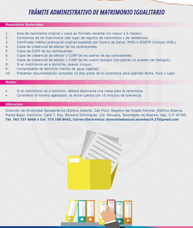 cumplir con la documentación básica entre otros documentos más. Además de que también se podrá realizar el tramite administrativo de matrimonio igualitario.
