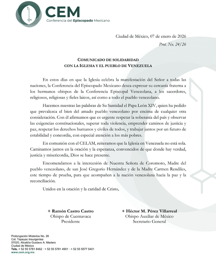 “Hacemos nuestras las palabras de Su Santidad el Papa León XIV, quien ha pedido que prevalezca el bien del amado pueblo venezolano por encima de cualquier otra consideración” así lo dio a conocer el CEM y agregó que es urgente respetar la soberanía del país y observar las exigencias constitucionales, superar toda violencia, emprender caminos de justicia y paz, respetar los derechos humanos y civiles de todos, y trabajar juntos por un futuro de estabilidad y concordia, con especial atención a los más pobres.
