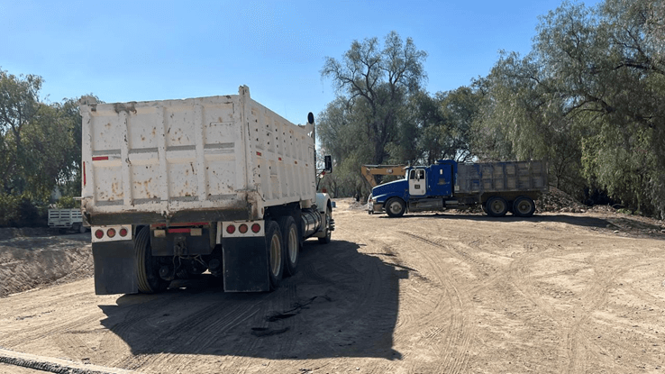 Transportistas que trabajan en la obra de revestimiento del canal Viejo Requena que cruza por el municipio de Tula realizan un paro de labores al no recibir su pago desde hace tres meses por parte de la compañía Irol que trabaja para la Comisión Nacional del Agua.