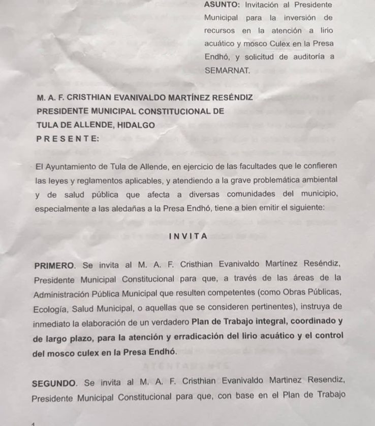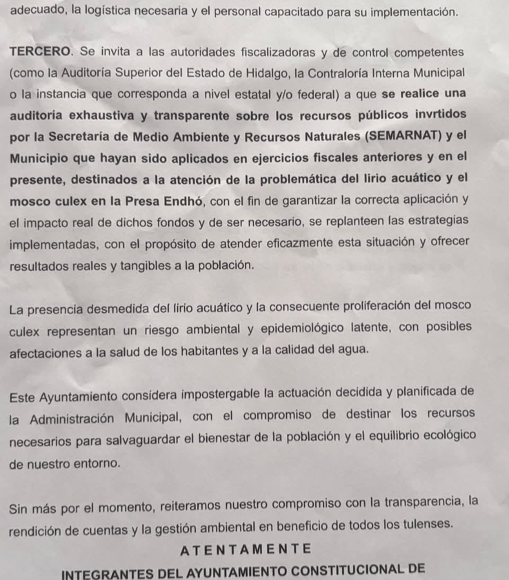 El presidente municipal de Tula, Cristhian Martínez y los regidores del partido Morena ignoraron el tema, en esta propuesta se realizó la invitación para que a través de las áreas de la administración pública municipal que resulten competentes (obras públicas, ecología, salud y otras más) se sumen a un verdadero plan de trabajo integral, coordinado y de largo plazo para la atención y erradicación del lirio acuático el control del mosco Culex.