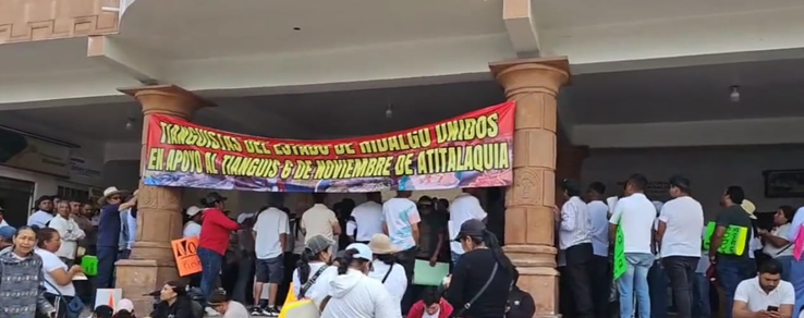 Los comerciantes del tianguis sobre ruedas denominado 6 de Noviembre se manifestaron el jueves desde temprano en la presidencia municipal, apoyados por sus compañeros tianguistas de otros municipios, como Actopan, Francisco I Madero y otros más del Valle del Mezquital, además de los tianguistas de San José, municipio de Tula de Allende, para pedirle a la presidenta municipal realizar una mesa de trabajo y concretar acuerdos en los que se fije un lugar adecuado que tenga además estacionamiento y sobre todo que no esté a un costado del canal de agua negra, como se pretende, ya que es hasta insalubre para aquellos que venden alimentos.